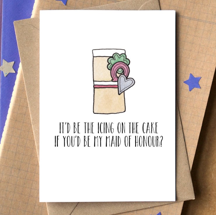 A simple, humorous wedding cake themed card - perfect to ask your closest friends to be your bridesmaid or maid of honour.