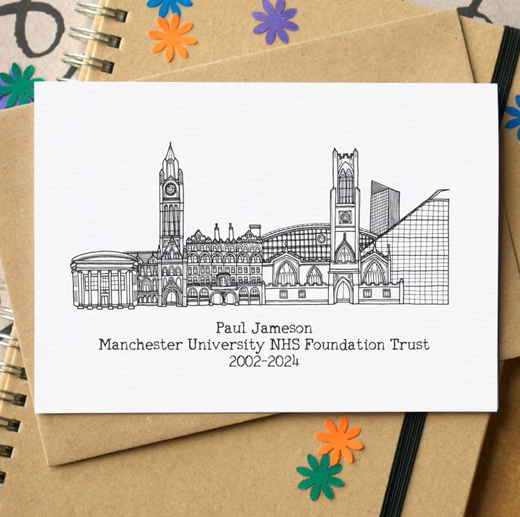 A special skyline card for a retirement, or for someone leaving a workplace - with your choice of town or city, and personalised message underneath.