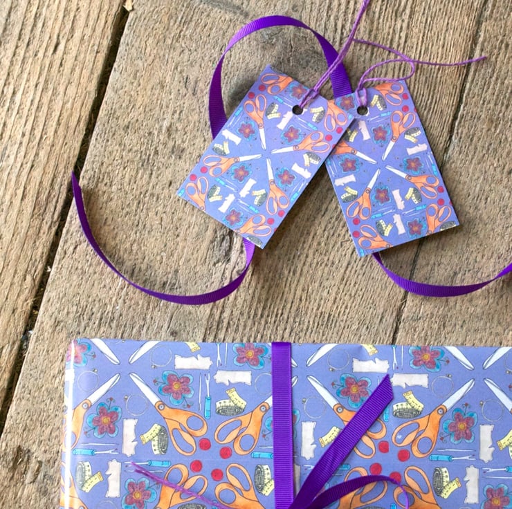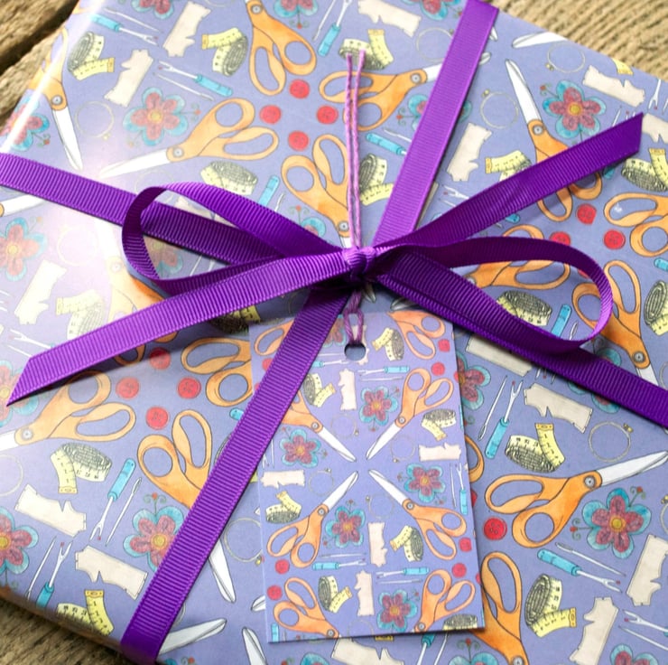 This fabulous purple sewing wrapping paper is the perfect finishing touch to any gift for a keen sewer.