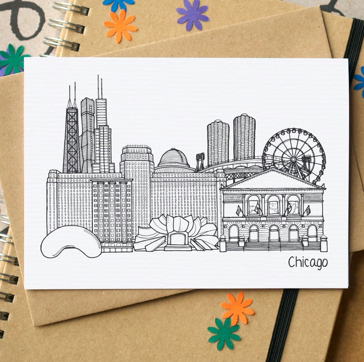 A blank card featuring an illustration of some of Chicago's greatest landmarks.