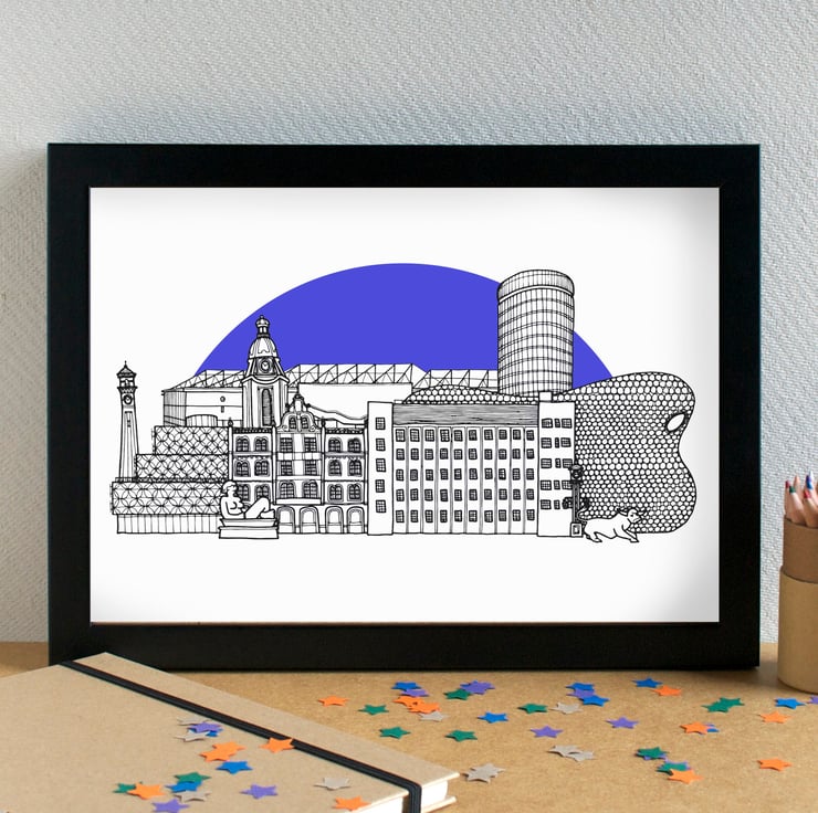 A lovely print of my illustration of the most famous contemporary landmarks in Birmingham, including Birmingham City Football Club's homeground stadium, St Andrew's. The print is completed with a Birmingham City FC blue "sunshine" background.