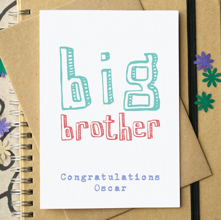 You can choose for the card to arrive personalised with the older brother's name at the bottom of the card if you'd like. If you choose the non-personalised option it will simply read "Congratulations" at the bottom of the card.