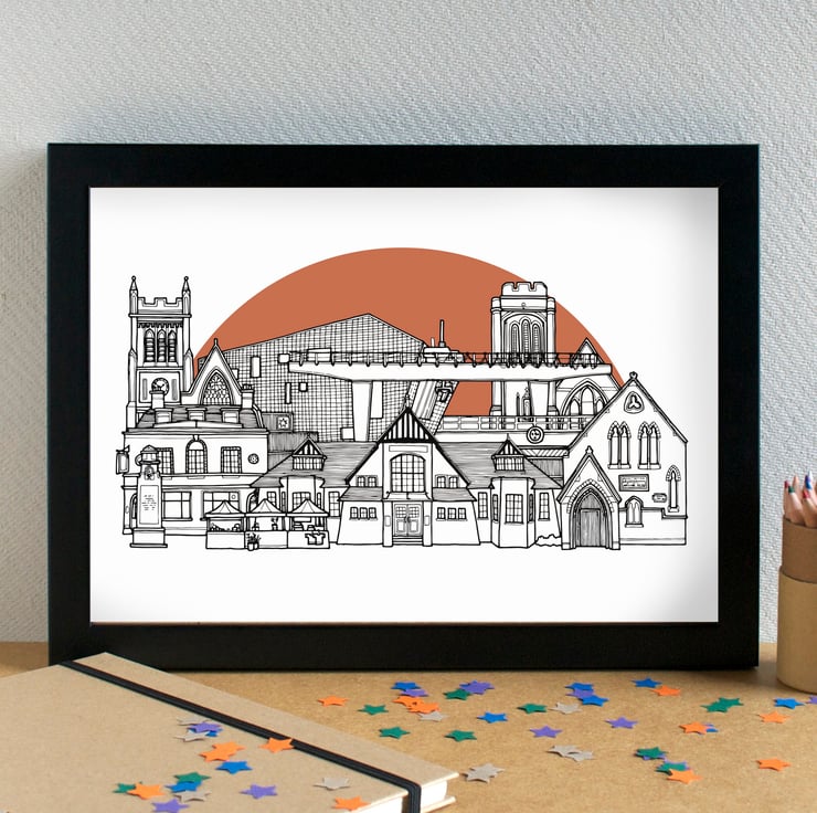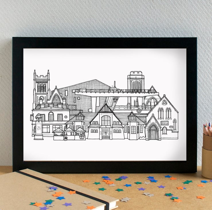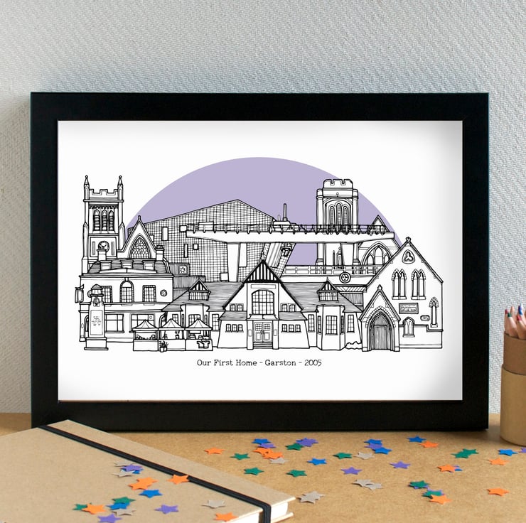 A pretty, detailed print of my skyline illustration of the most famous contemporary landmarks in South Liverpool's Garston.