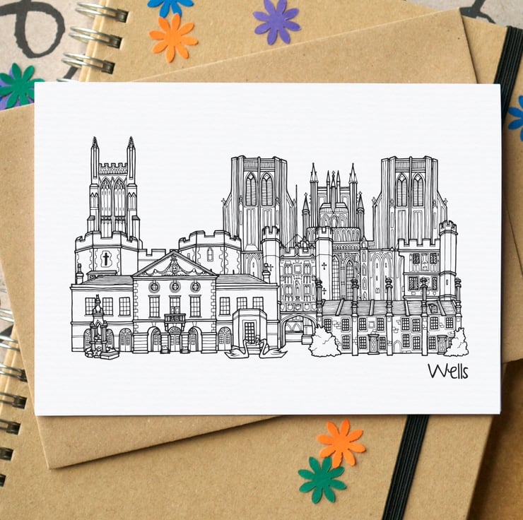 A blank card featuring an illustration of some of Wells' greatest landmarks.