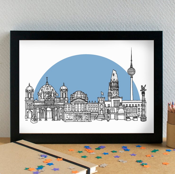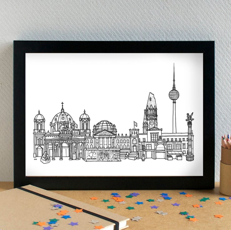 I drew the cityscape using pen and ink, by hand, and then worked on it digitally to create up with the final image. It features the Berlin Cathedral, Brandenburg Gate, the Reichstag, Markhalle Neun, the Neues Museum, a little snippet of the East Side Gallery, a tiny part of the Memorial to the Murdered Jews of Europe, the Fernsehturm TV Tower, Kaiser Wilhelm Memorial Church (the "Broken Tooth Church"), the Siegess ule Victory Statue, and finished off with some smaller details - K the Kollwitz's "Mother with her Dead Son" statue, two little "stolperstein" stumbling blocks and a set of road crossing lights.