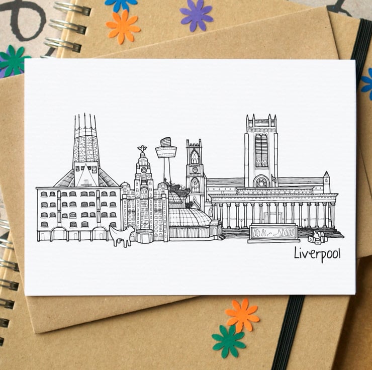 This folded greetings card features a black and white line drawing of the iconic Liverpool skyline. Made up of all the most famous landmarks, it's a beautifully drawn Liverpool cityscape.