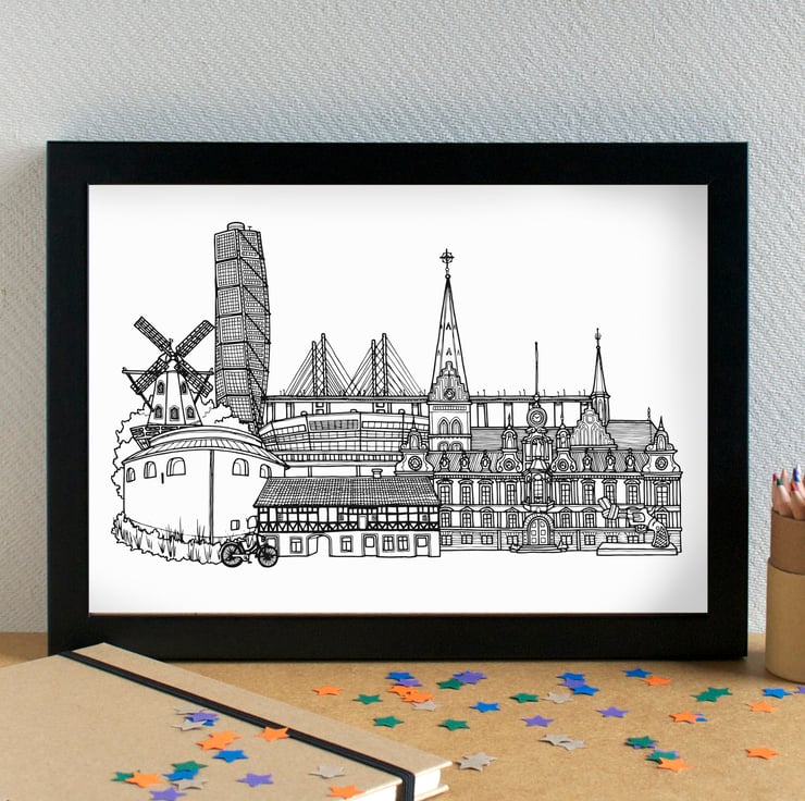 A stunning print of my detailed hand-drawn skyline illustration of the most famous landmarks in Malmö, Sweden.