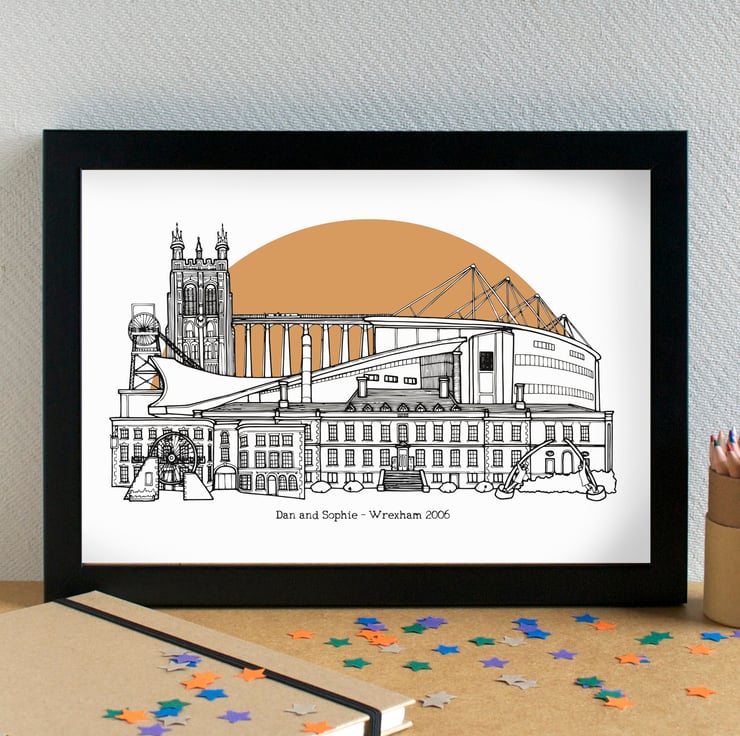 You can customise your Wrexham skyline by choosing a coloured arc - or "sunshine" - to add to the background, and you can also add a line of personalised text to the bottom of the illustration.