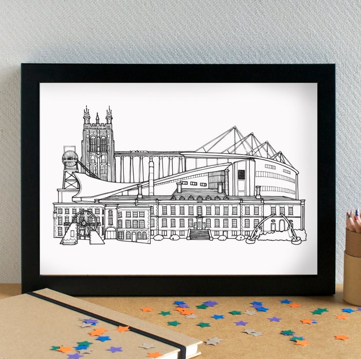 My Wrexham illustration was drawn using pen and ink, by hand, and has then been digitally manipulated to come up with the final image. It features the Wynnstay Arms, Erddig Hall, Wrexham Racecourse, Waterworld, Pontcysyllte Aqueduct, Bersham Colliery Wheel, St Giles' Church, the Gresford Colliery Memorial and The Arc sculpture.