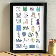 My South Downs illustration was drawn using pen and ink, by hand, and has then been digitally manipulated to come up with the final image. It features the Ditchling Dew Pond, Uppark House, Butser Ancient Farm, Beachy Head Lighthouse, Seven Sisters, Chanctonbury Ring, the Jack and Jill Windmills, the Long Man of Wilmington and a little paraglider.