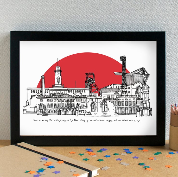 A lovely, detailed print of my skyline illustration of the most famous landmarks in Barnsley, South Yorkshire, complete with Oakwell Stadium and a Barnsley FC red background.