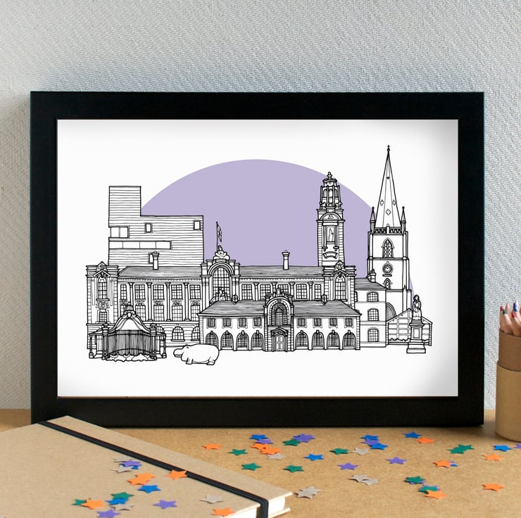 I illustrated this skyline using pen and ink, by hand, and then touched it up digitally to arrive at the final image. It features the Arboretum Bandstand, the Old Library, the Town Hall, the Leather Museum, St Matthew's Church, the Art Gallery and of course a little Sister Dora and the Stone Hippo to finish it off.