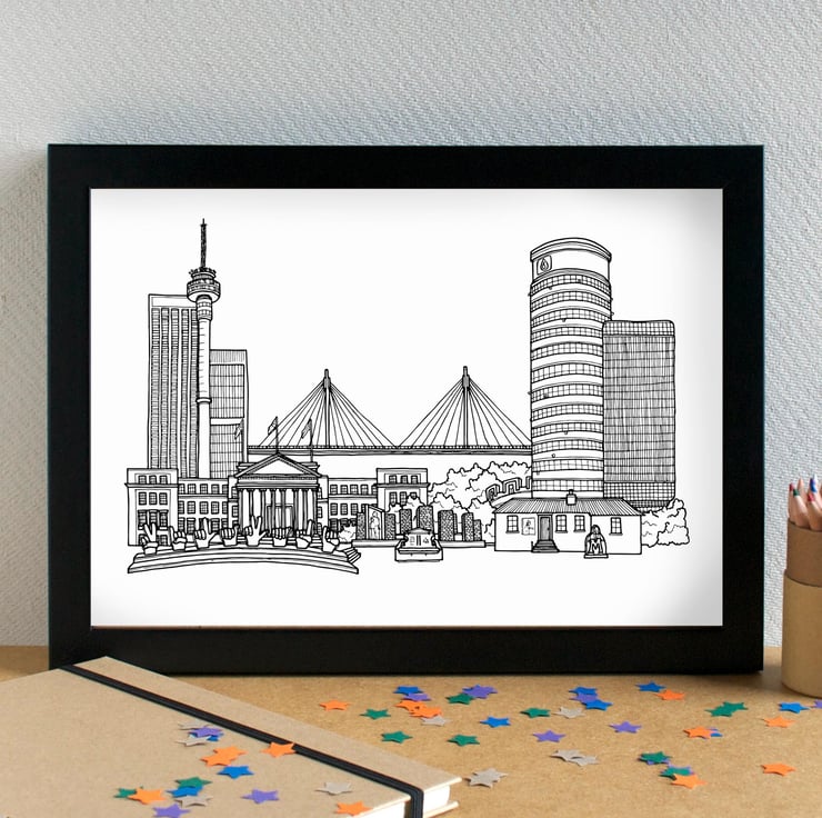 A black and white line drawn art print of my skyline illustration of the most famous landmarks in Johannesburg.