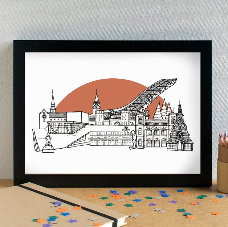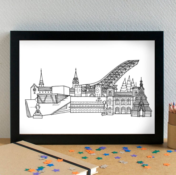 A stunning print of my illustration of the most famous landmarks on the Oslo skyline.