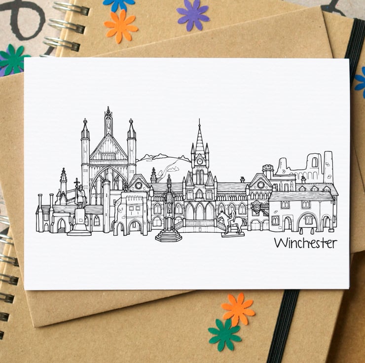 A blank card featuring an illustration of some of Winchester's greatest landmarks.