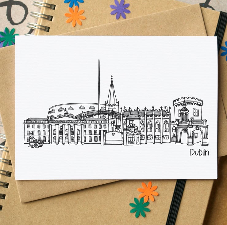 A blank card featuring an illustration of some of Dublin's greatest landmarks.