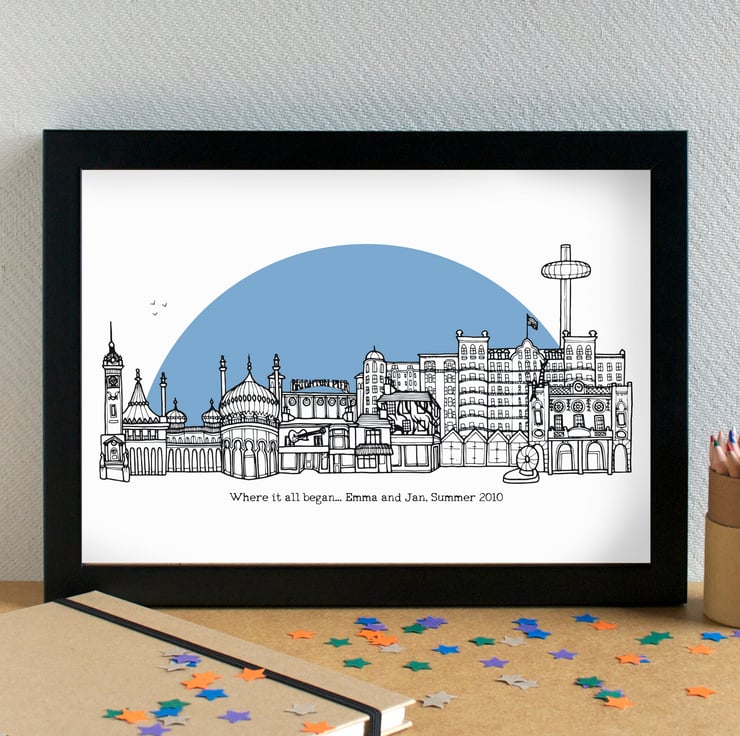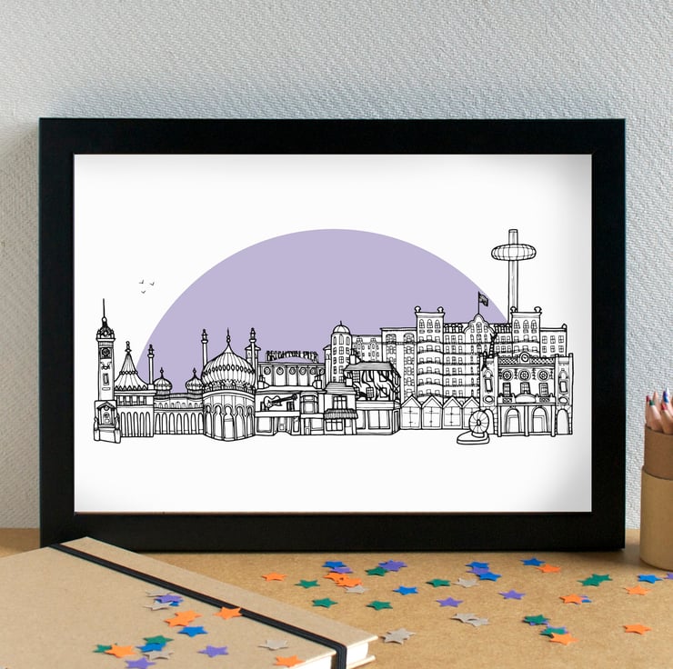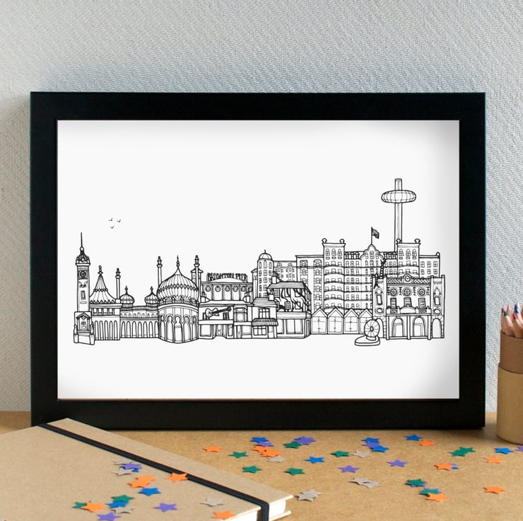 A pretty, detailed print of my hand drawn illustration of the most famous landmarks in Brighton and Hove.