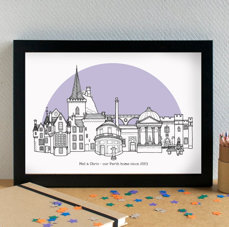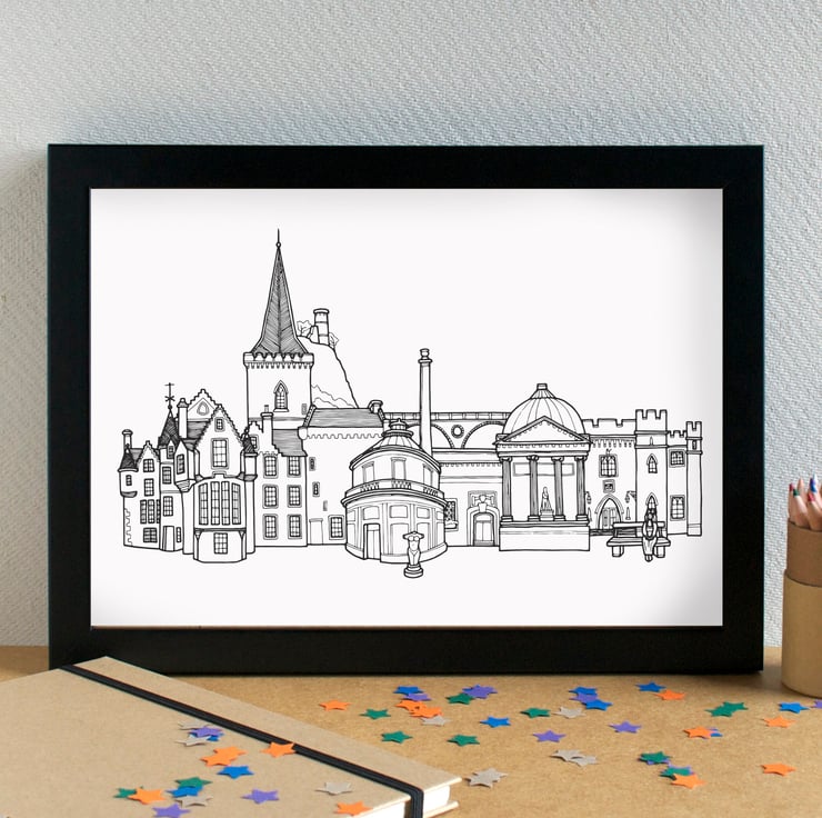 A pretty art print of my hand-drawn skyline illustration of the most famous landmarks in Perth, Scotland.
