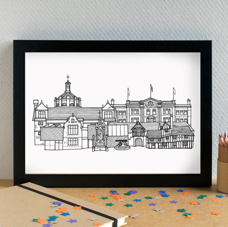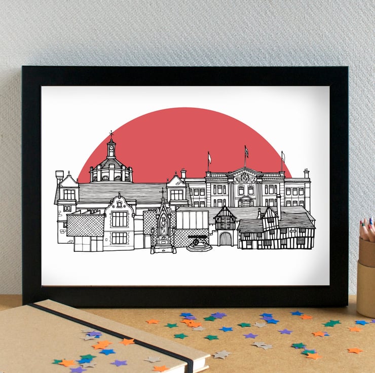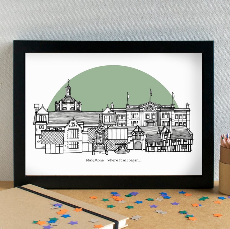A pretty, unique print of my hand drawn skyline illustration of the most famous landmarks in Maidstone, Kent.