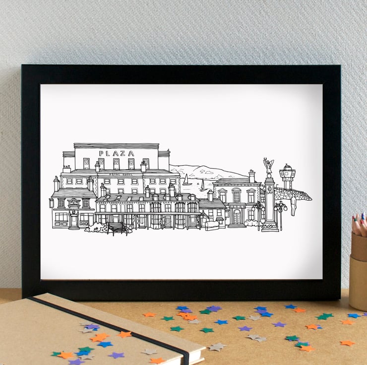 I drew this illustration by hand, using pen and ink, and then digitally manipulated to come up with the final image. It features the Plaza, Royal Hotel, Volunteer Canteen, Marine Terrace, the Town Hall, Five Lamps War Memorial, Another Place, the Radar Tower, the marine lake and a pretty little bench from the waterfront gardens.