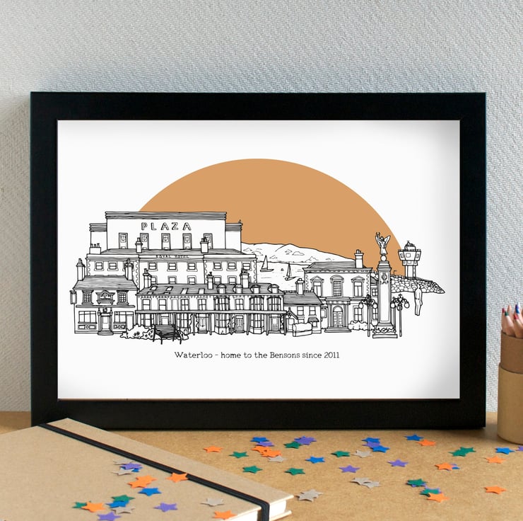 A pretty, detailed print of my skyline illustration of the most famous contemporary landmarks in Waterloo, Merseyside.