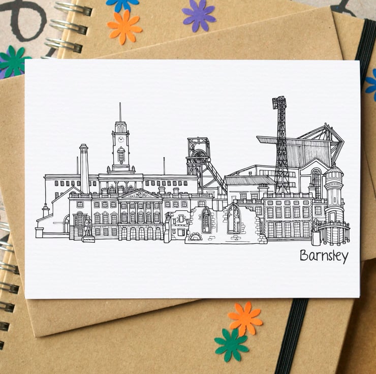 A blank card featuring an illustration of some of Barnsley's most iconic landmarks.