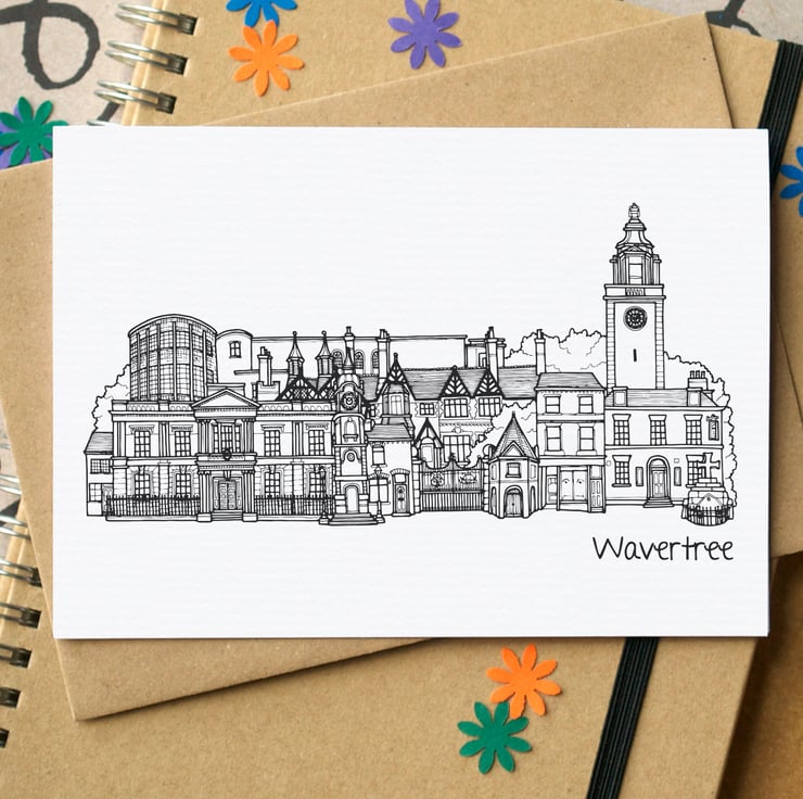 A blank greetings card featuring a special skyline illustration of some of the most iconic and memorable landmarks in South Liverpool's Wavertree.