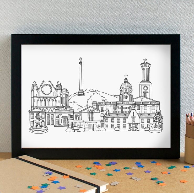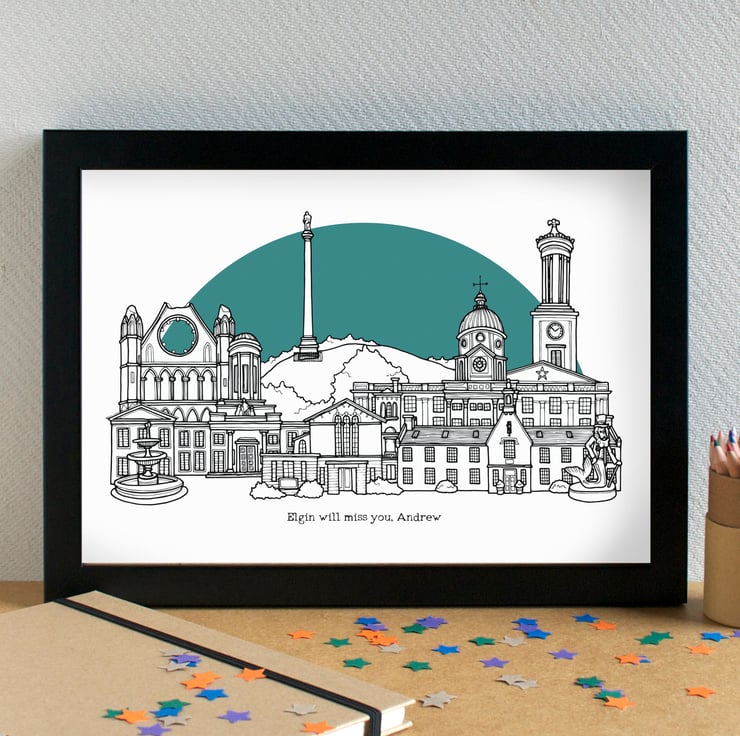 A lovely print of my pretty skyline illustration of the most famous landmarks in Elgin, Scotland.