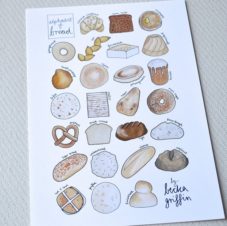 This print features a little image for each letter of the alphabet, each of which is labelled (just in case you can't guess them)! It's printed from an original image; I drew each little picture by hand and coloured them by hand using watercolour paint.