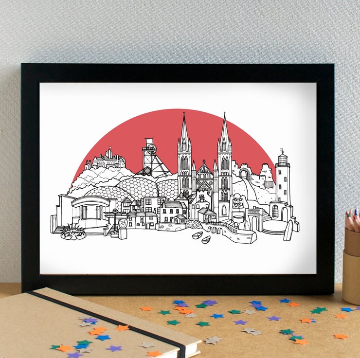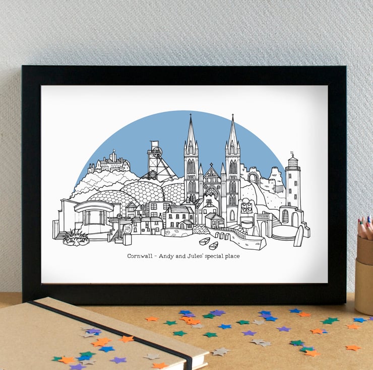 This lovely illustration was drawn using pen and ink, by hand, and has then been digitally manipulated to come up with the final image. It features the Tate St Ives, St Ives Harbour, Truro Cathedral, The Minack Theatre, Godrevy Lighthouse, Tintangel Castle, The Eden Project, Geevor Tin Mine, St Michael's Mount,the Lost Gardens of Heligan, a little Barbara Hepworth sculpture, the infamous Land's End sign... and is finished with some little boats.