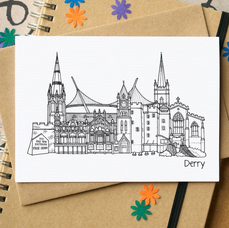 A blank card featuring a skyline illustration of some of Derry Londonderry's greatest landmarks.
