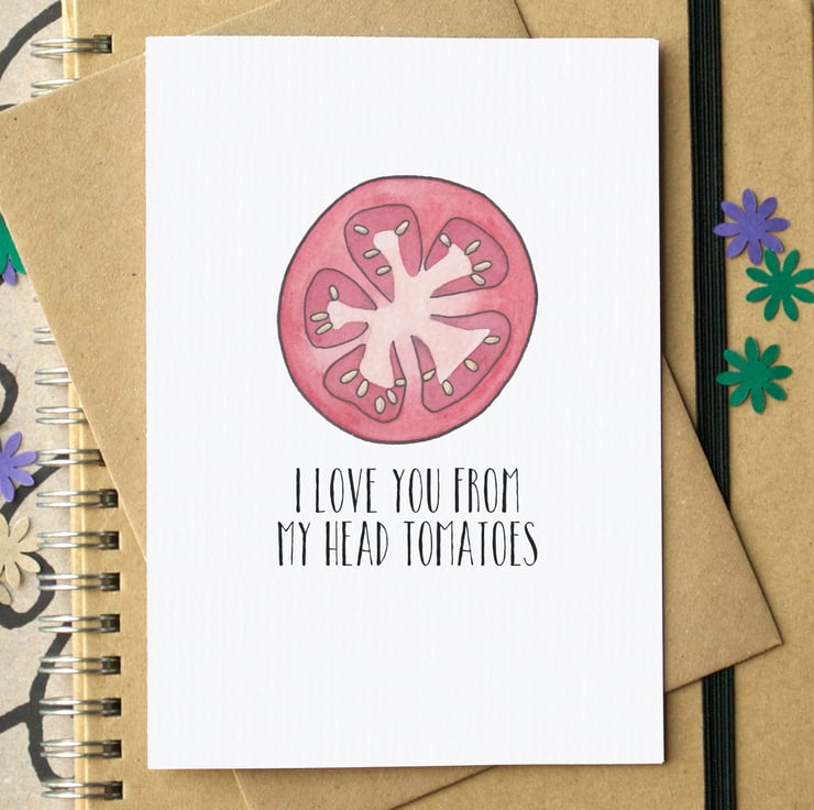 The card features my illustration of a lovely sliced tomato - which I drew by hand and then coloured with watercolour paint. The phrase "I Love You From My Head Tomatoes" accompanies the tomato.