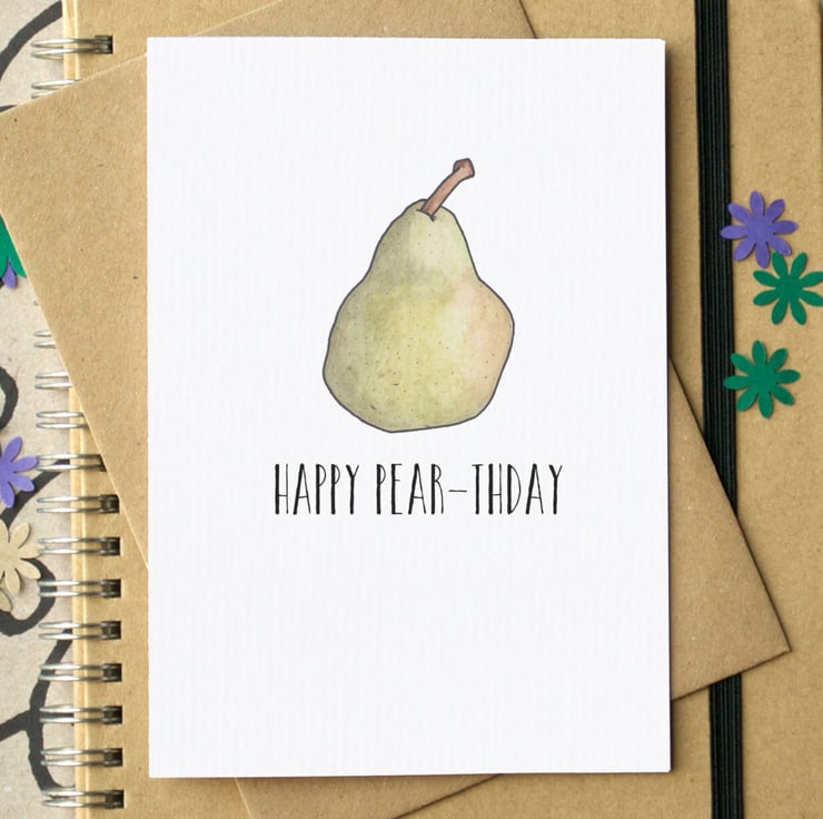 A funny birthday card for a friend - featuring a green pear and the phrase "Happy Pear-thday".