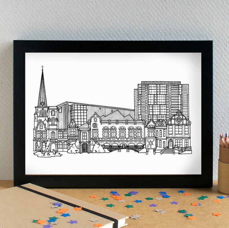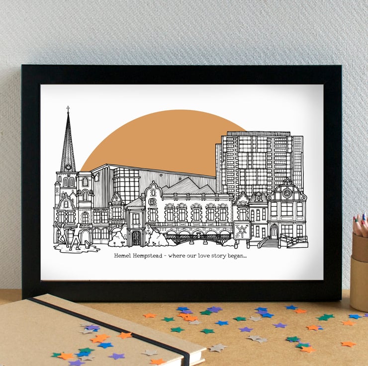 My Hemel Hempstead skyline illustration was drawn by hand, then finished digitally. It features the Old Town Hall, Boxmoor Hall, Kd Tower, the ski centre, St Mary's and St Paul's Church, Charter Tower (the entrance to Gadebridge Walled Gardens), Gadebridge Park Bridge, the Magic Roundabout sign and the striking "Rock'n'Roll" statue from the Water Gardens.