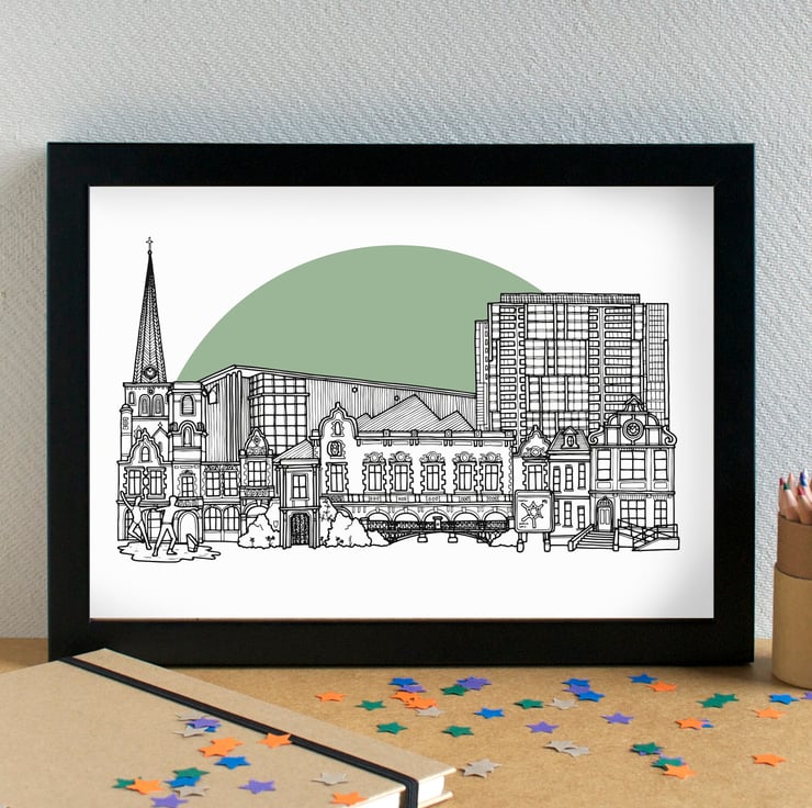 A pretty art print of my skyline illustration of the most famous landmarks in Hemel Hempstead, Hertfordshire.