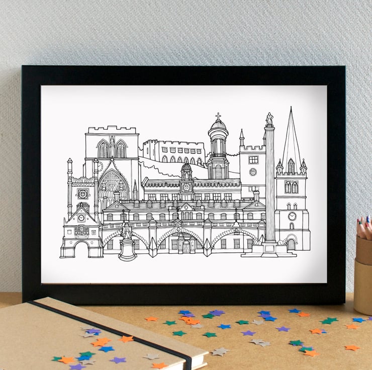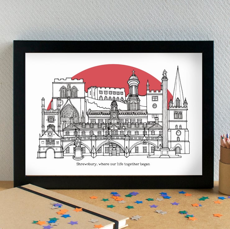 A pretty print of my skyline illustration of the most famous landmarks in Shrewsbury, Shropshire.