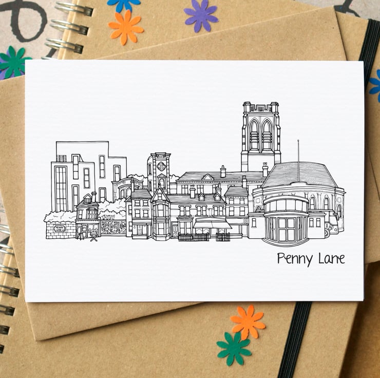 A blank greetings card featuring a special skyline illustration of some of Liverpool's infamous Penny Lane's most iconic landmarks.