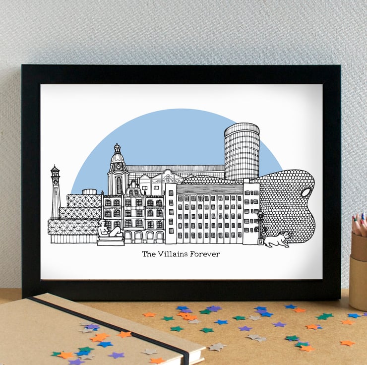 A pretty print of my illustration of the most famous contemporary landmarks in Birmingham, including Aston Villa's homeground stadium, Villa Park - and a Villa blue background "sunshine".