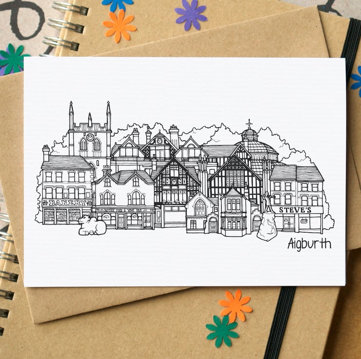 A blank greetings card featuring a special skyline illustration of some of the most iconic and memorable landmarks in South Liverpool's Aigburth.