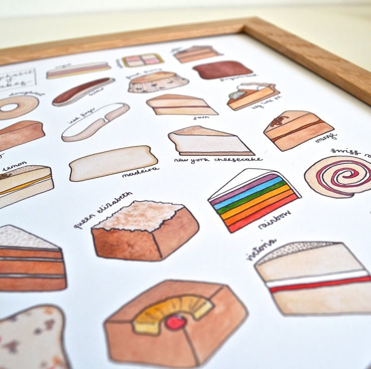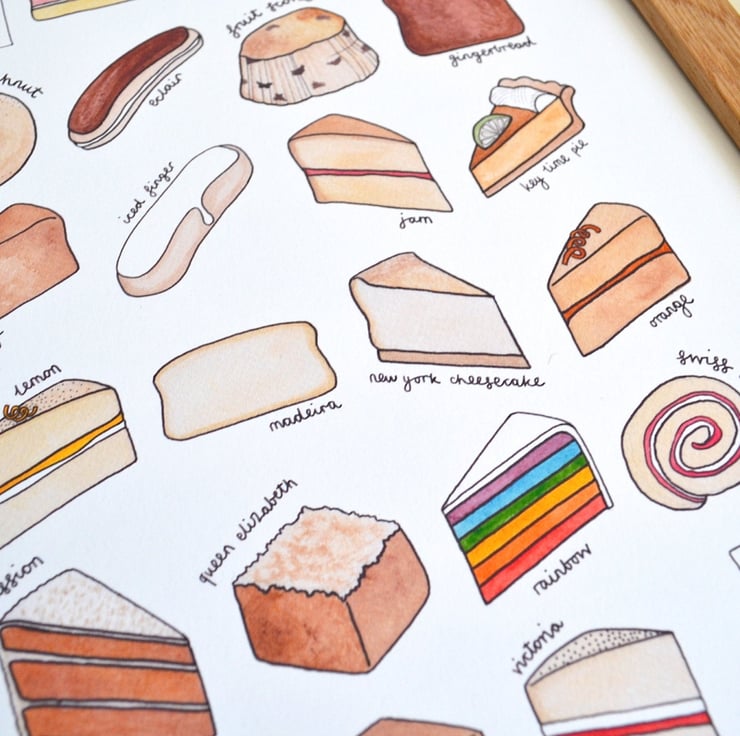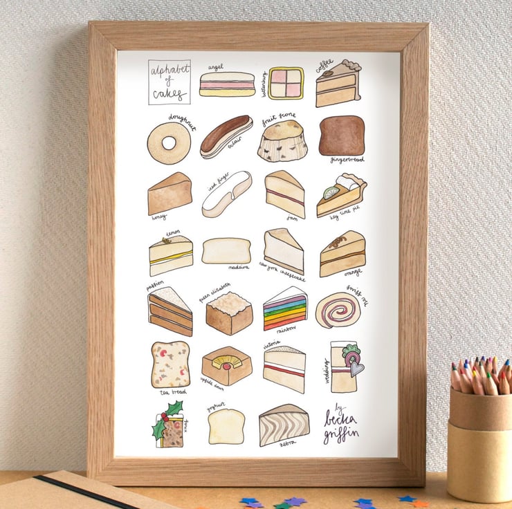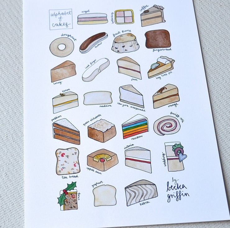 A whole alphabet of delicious cake, drawn and painted by hand.