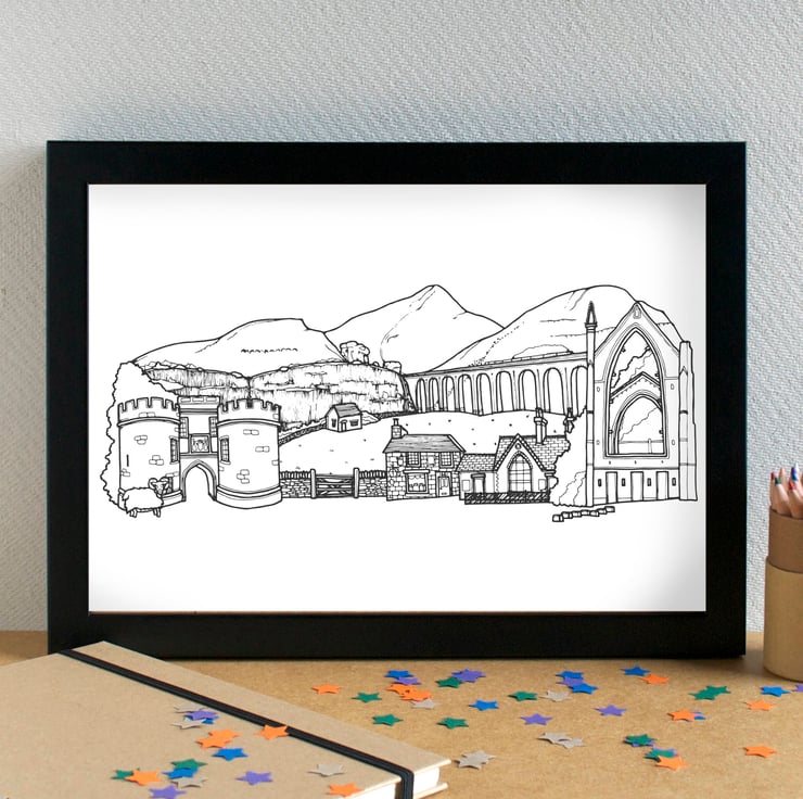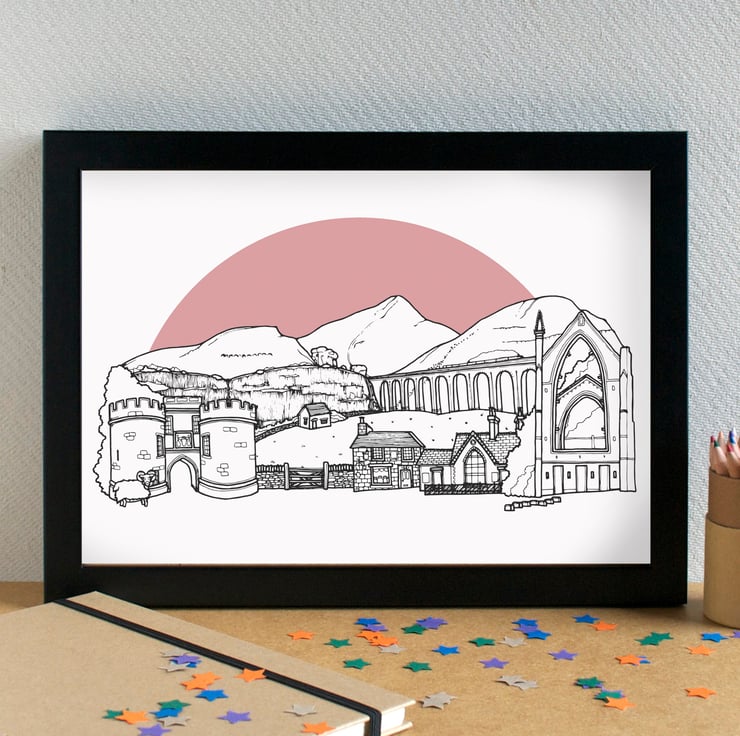 A stunning print of my hand-drawn illustration of the most famous landmarks in the beautiful Yorkshire Dales.