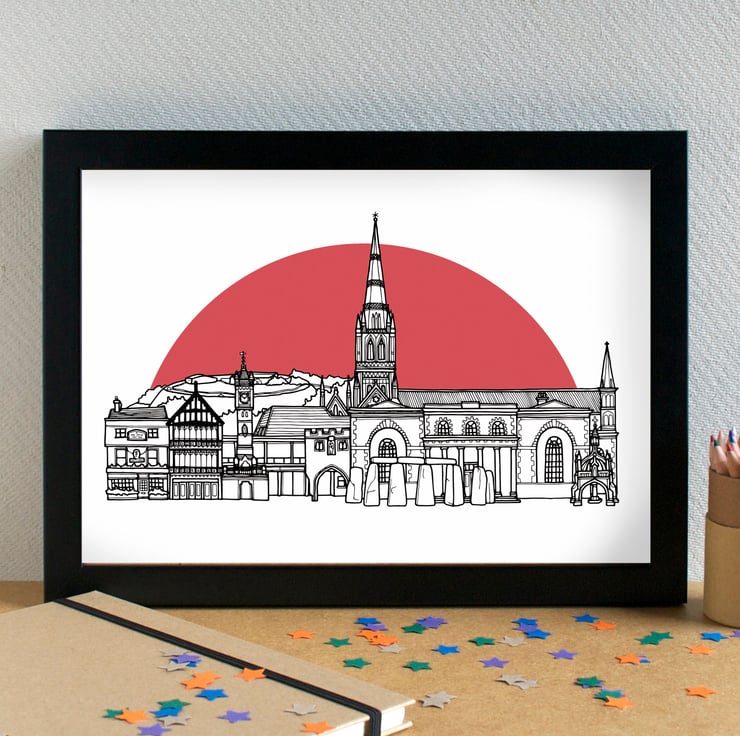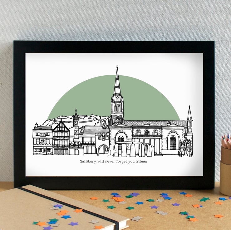 A stunning, detailed print of my illustration of the most famous landmarks in Salisbury, Wiltshire.