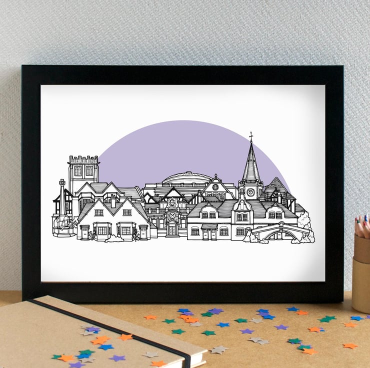 A pretty print of my skyline illustration of the most famous landmarks in Wirral's beautiful Port Sunlight.