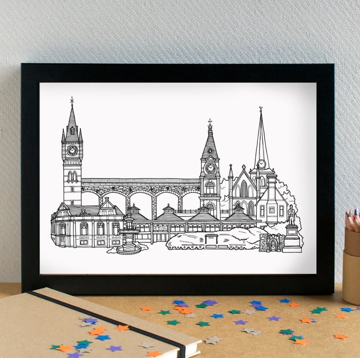 A black and white print of my skyline illustration of the most famous landmarks in Darlington, County Durham.