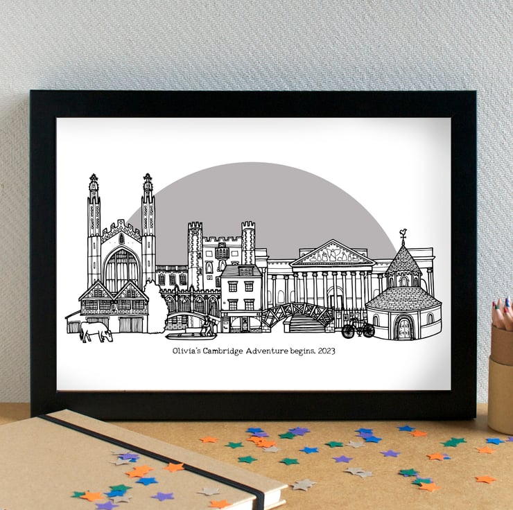 A pretty print of my illustration of the most famous landmarks in charming Cambridge.