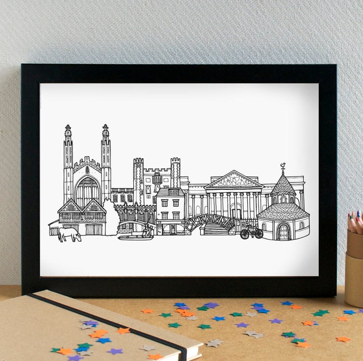 My Cambridge illustration was drawn using pen and ink, by hand, and has then been digitally manipulated to come up with the final image. It features King's College Chapel, Darwin College Boat House, the Bridge of Sighs, Fitzbillies Cafe, Trinity College, the Mathematical Bridge, the Fitzwilliam Museum, the Round Church, a little bicycle in front of some railings covered in posters, a punt and a grazing cow.