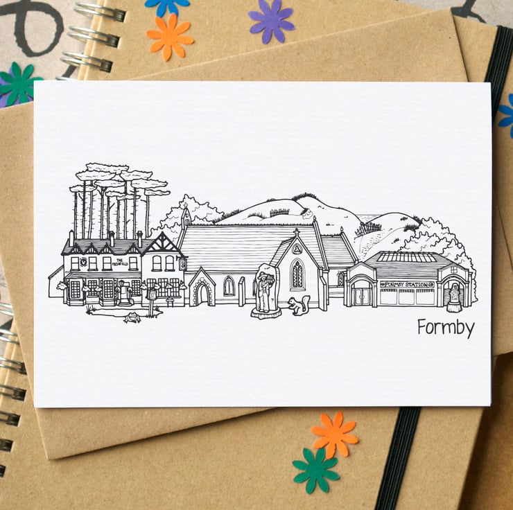 A blank greetings card featuring a special skyline illustration of some of the most famous landmarks in Formby, Merseyside.