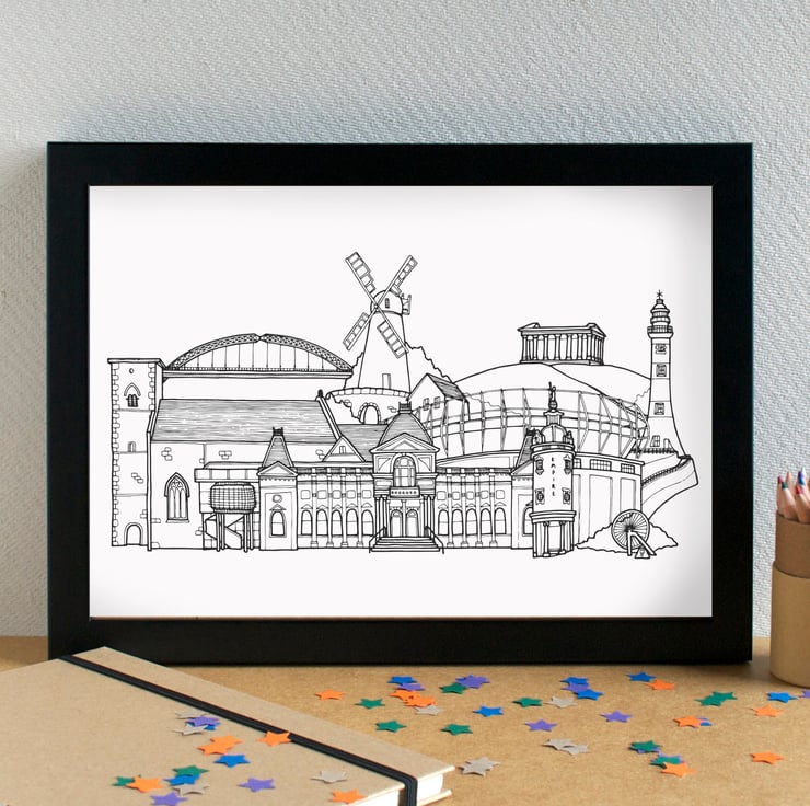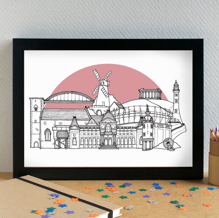 A gorgeous print of my skyline illustration of the most famous landmarks in Sunderland.