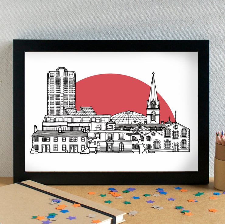 I illustrated this skyline using pen and ink, by hand, and then touched it up digitally to arrive at the final image. It features the Railway Village Museum, Swindon Museum and Art Gallery, the STEAM Museum, Christ Church, Lydiard House, Oasis Leisure Centre, Wyvern Theatre, David Murray John Tower, and is finished with a little Coate Water Park diving board and a sign for the Magic Roundabout.
