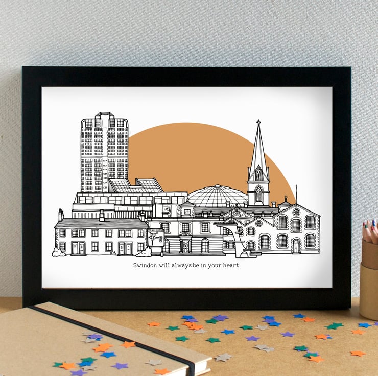 You can customise your Swindon skyline by choosing a "sunshine" background colour - as well as adding a single line of personalised text to the bottom of the illustration too.